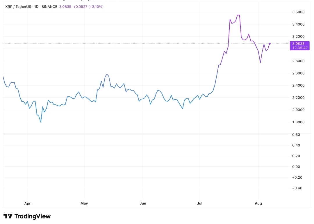 Il primo traguardo è una chiusura sopra $3.185. Questo livello ha precedentemente funzionato come zona di rifiuto alla fine di luglio. Pertanto, superare $3.185 con convinzione invertirebbe il sentimento in modo più decisivo a favore dei tori. Oltre a questo, l'analista ha evidenziato $3.25 come il prossimo punto di controllo chiave, e superarlo metterebbe XRP in una posizione tecnica forte.