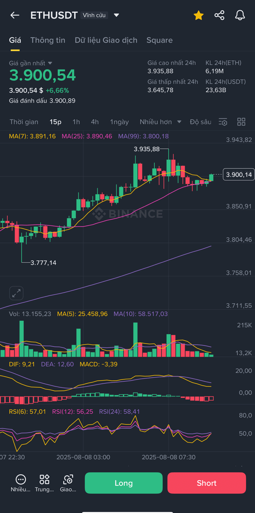 Il grafico a 15 minuti mostra che ETH ha rimbalzato più volte quando ha toccato 3.800, evidenziando una zona di supporto solida. Il prezzo attuale supera leggermente MA25 (3.890) e RSI(6) è a livello 57 – c'è ancora spazio per salire. MACD ha ristretto la zona negativa, avvicinandosi a zero → la forza d'acquisto sta tornando.