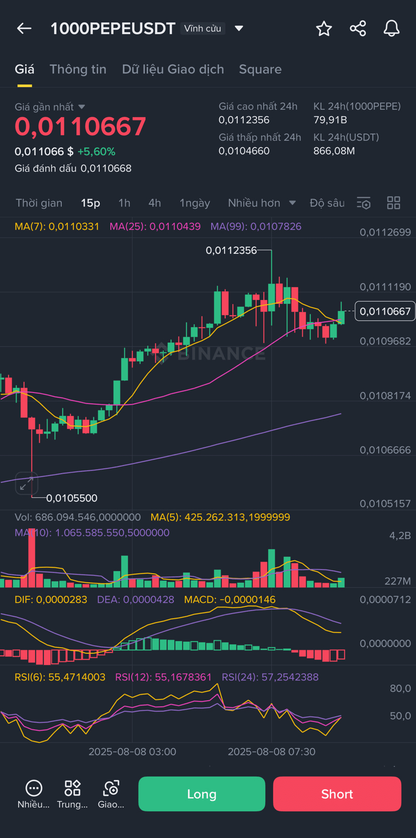 Dopo molti giorni di trading piuttosto tranquillo, $PEPE è esploso inaspettatamente con un forte aumento dalla zona 0.00986, continuando a salire e toccando un nuovo massimo a 0.0112356. Subito dopo, il mercato è entrato in una leggera correzione – come una pausa per prendere fiato dopo una corsa veloce. La domanda è: è solo una fase di “respiro” prima di continuare il cammino verso nuovi massimi, oppure è un segnale di indebolimento? Vediamo insieme ogni intervallo di tempo per capire cosa stia dicendo il quadro generale di PEPE in questo momento.