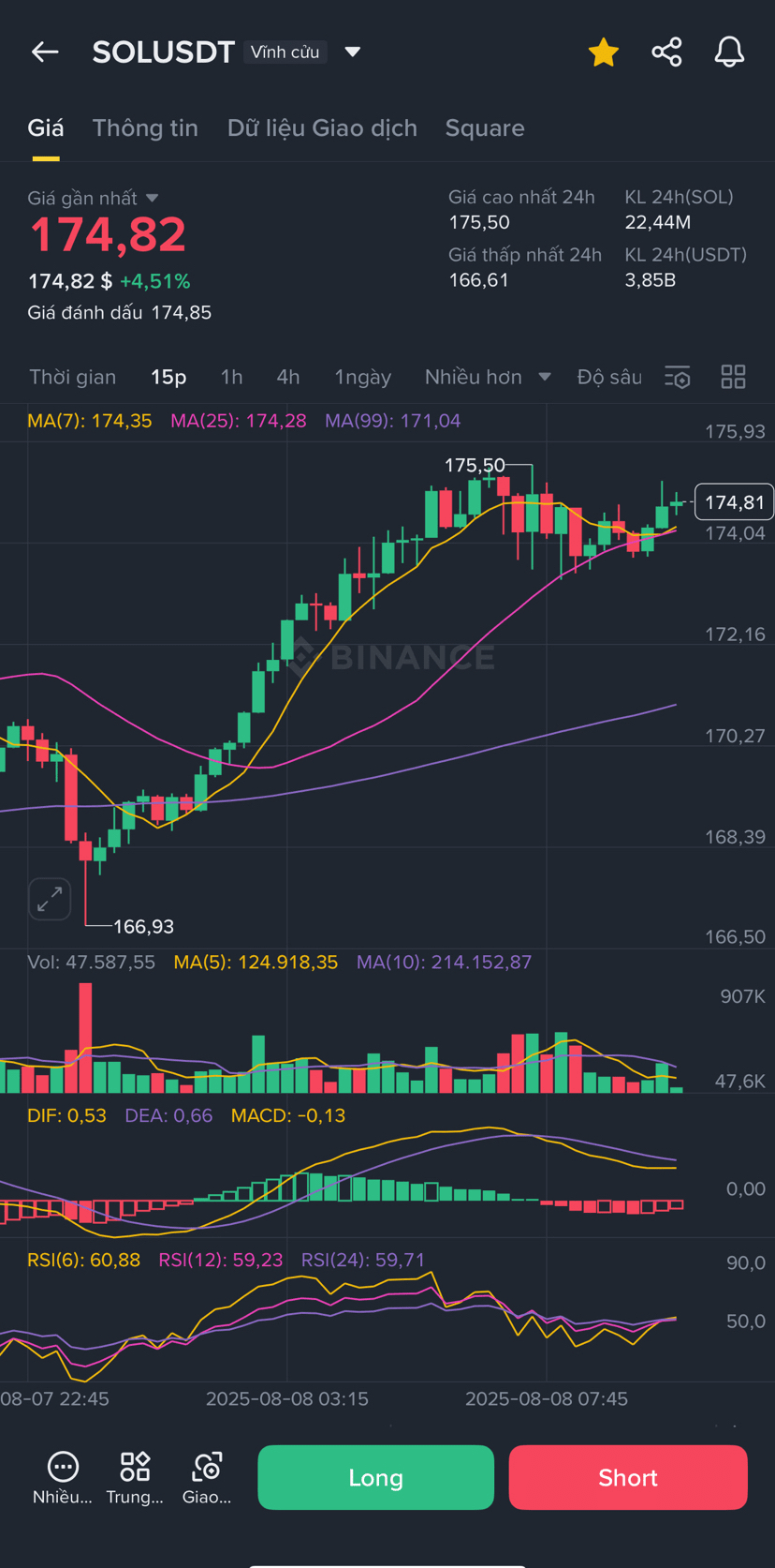 Nel grafico a 4 ore, SOL è rimbalzato fortemente da 155 a 175 e poi ha corretto leggermente vicino a MA7 (171), rimanendo sopra MA25 (167) → la struttura rialzista è ancora solida.