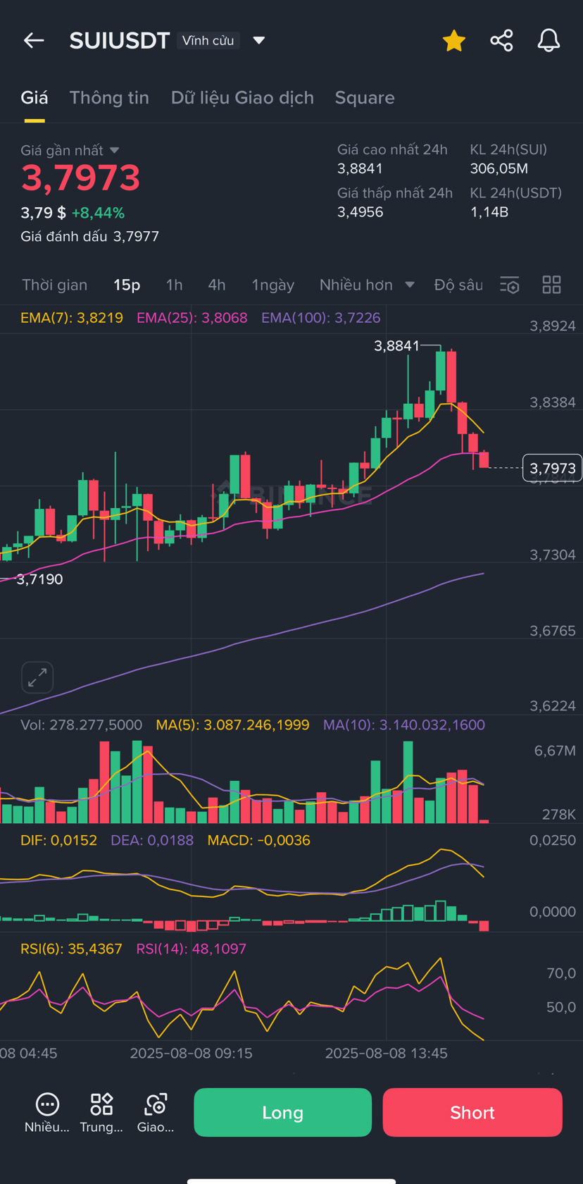 Nel grafico a 1 ora, dopo un forte aumento da 3.3681 a 3.8841, SUI ha iniziato a prendere profitti leggeri. Attualmente il prezzo è vicino all'EMA7 (3.8011) e rimane sopra l'EMA25 (3.7289) → la struttura rialzista è ancora intatta.