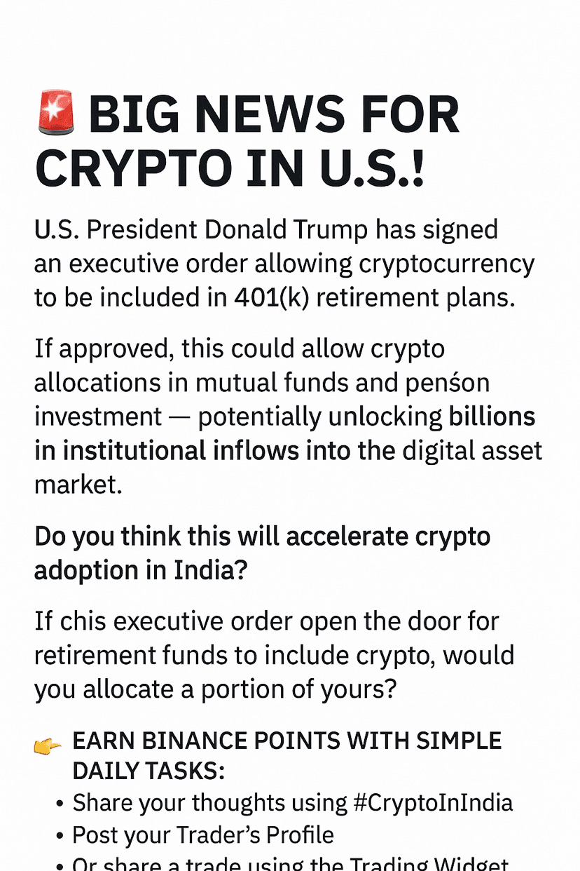 Se approvato, questo potrebbe consentire allocazioni crypto nei fondi comuni e nei piani pensionistici — sbloccando potenzialmente miliardi di afflussi istituzionali nel mercato degli asset digitali.