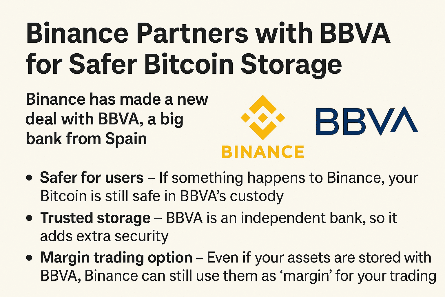 Più sicuro per gli utenti: Se succede qualcosa a Binance, il tuo Bitcoin è comunque al sicuro nella custodia di BBVA.