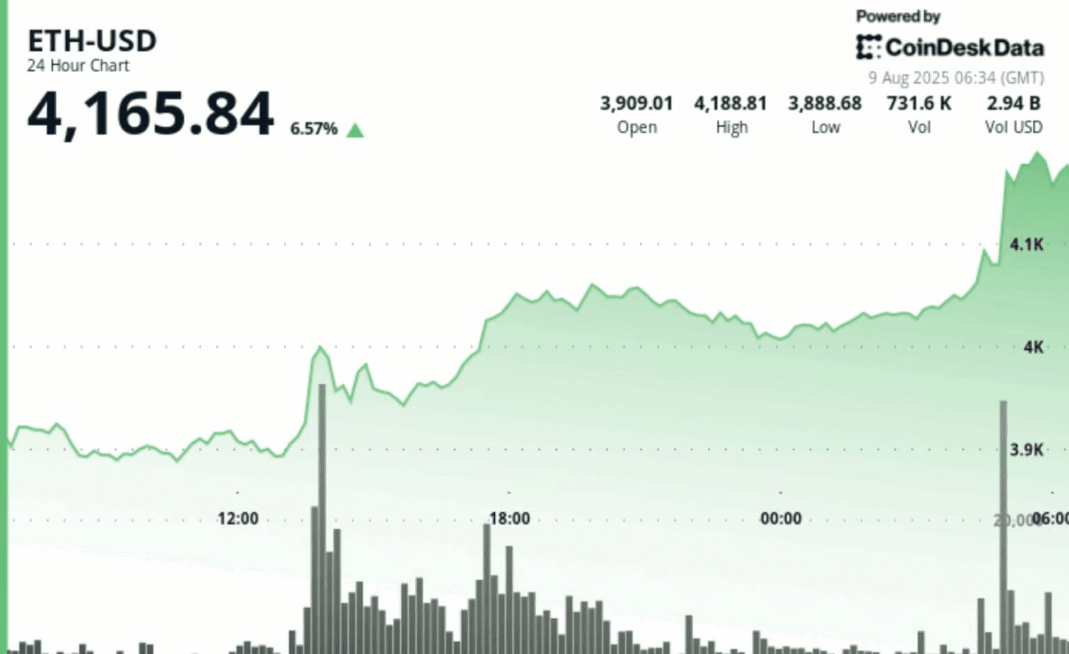 Tecnicamente, ETH è passato da $3,914.59 l'8 agosto a $4,160.29 il 9 agosto, con il volume degli scambi che è triplicato. Il rally è stato il risultato di due importanti breakout, raggiungendo un picco sopra $4,190 prima di ritirarsi leggermente a causa della presa di profitto. I segnali attuali del mercato indicano una consolidazione e gli analisti avvertono di prestare attenzione a causa della potenziale volatilità.$ETH