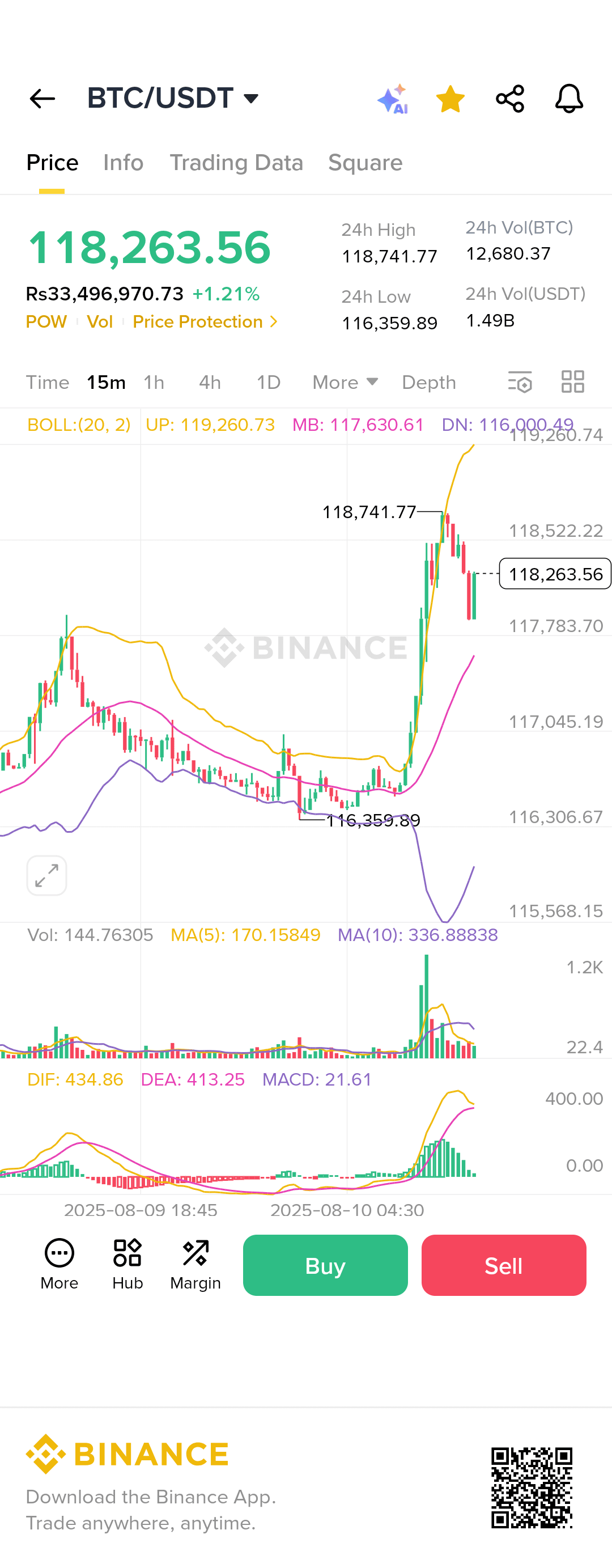 BTC ha toccato un minimo di 116.359,89, dopo di che si è formata una forte candela bullish che è arrivata fino a 118.741,77.