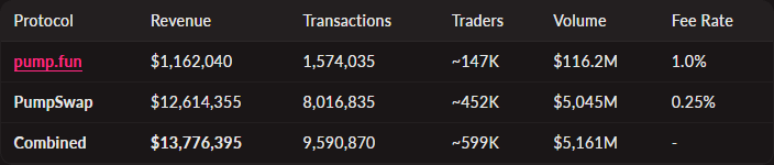 PumpSwap: tasso più basso (0,25%), ma volume delle transazioni superiore di 43 volte, dominando le entrate