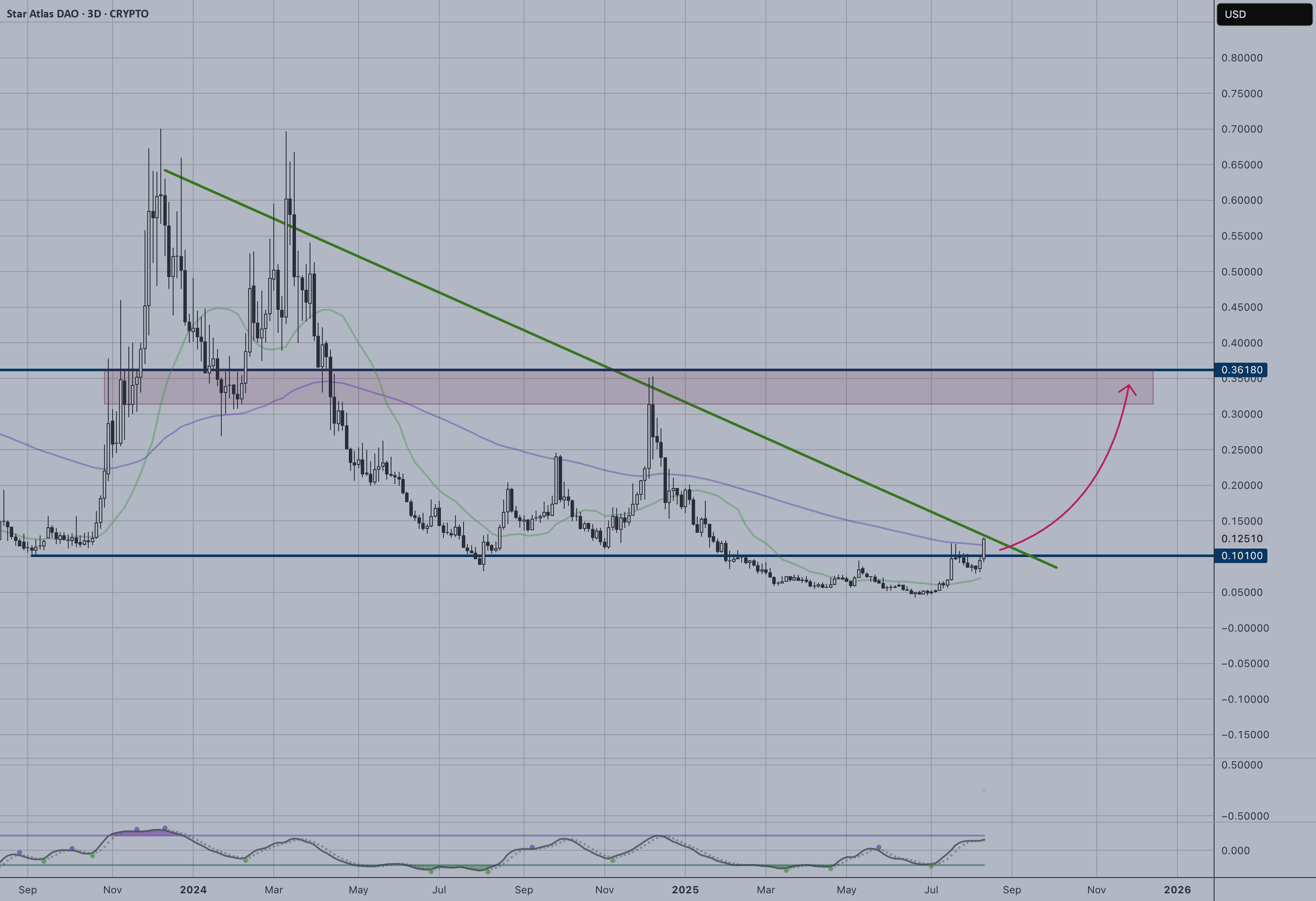 Star Atlas DAO ha riconquistato con successo il suo intervallo di trading chiave dopo un prolungato trend al ribasso, segnando un significativo sviluppo tecnico. Il prezzo è tornato a superare la zona di supporto cruciale intorno a $0.10700 e ora punta alla resistenza superiore a $0.36180.