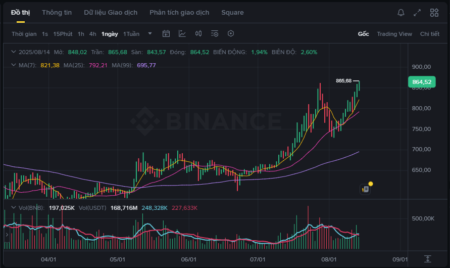 Tendenza del mercato generale: Dall'inizio di agosto, BNB ha superato progressivamente i livelli $760 → $820 → $830 e ora è a $860, seguendo la tendenza al rialzo dell'intero mercato.