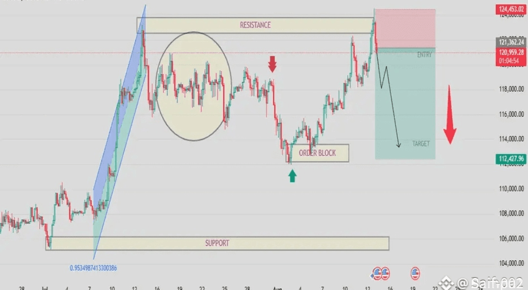Ribaltamento ribassista dalla resistenza in BTC/USDT Bitcoin è sceso al di sotto dell'area di ingresso designata dopo aver subito un forte rifiuto dalla zona di resistenza di $122K–$124K. La struttura del grafico suggerisce che il prezzo scenderà nell'intervallo target di $114K, con la possibilità di salire a $112K o addirittura $110K se il momento continua. $BTC
