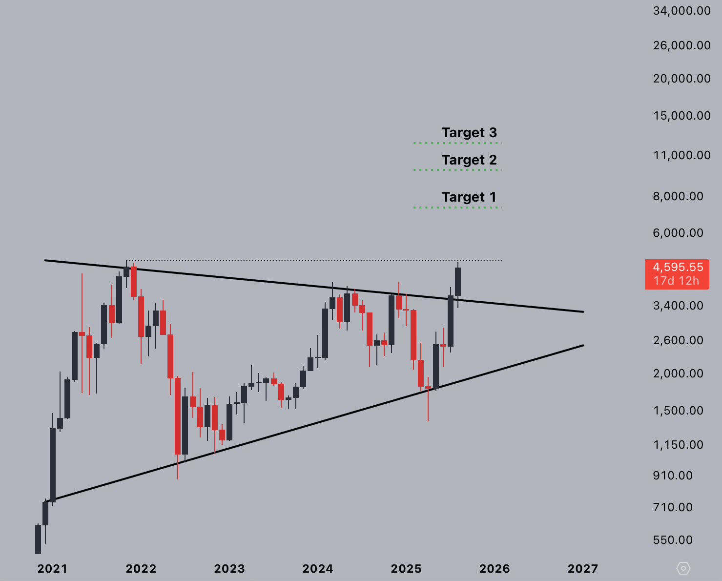Il prezzo di Ethereum è rimbalzato fortemente dai minimi di 1.500 dollari di aprile, raggiungendo ora i 4.700 dollari, a solo il 3% dal massimo storico. Questo rimbalzo ha riacceso la fiducia del mercato nelle altcoin, con Ethereum che è diventato il leader del mercato. Le attuali previsioni di prezzo indicano che potrebbe superare i 4.891 dollari, scatenando ulteriori ondate di speculazione.