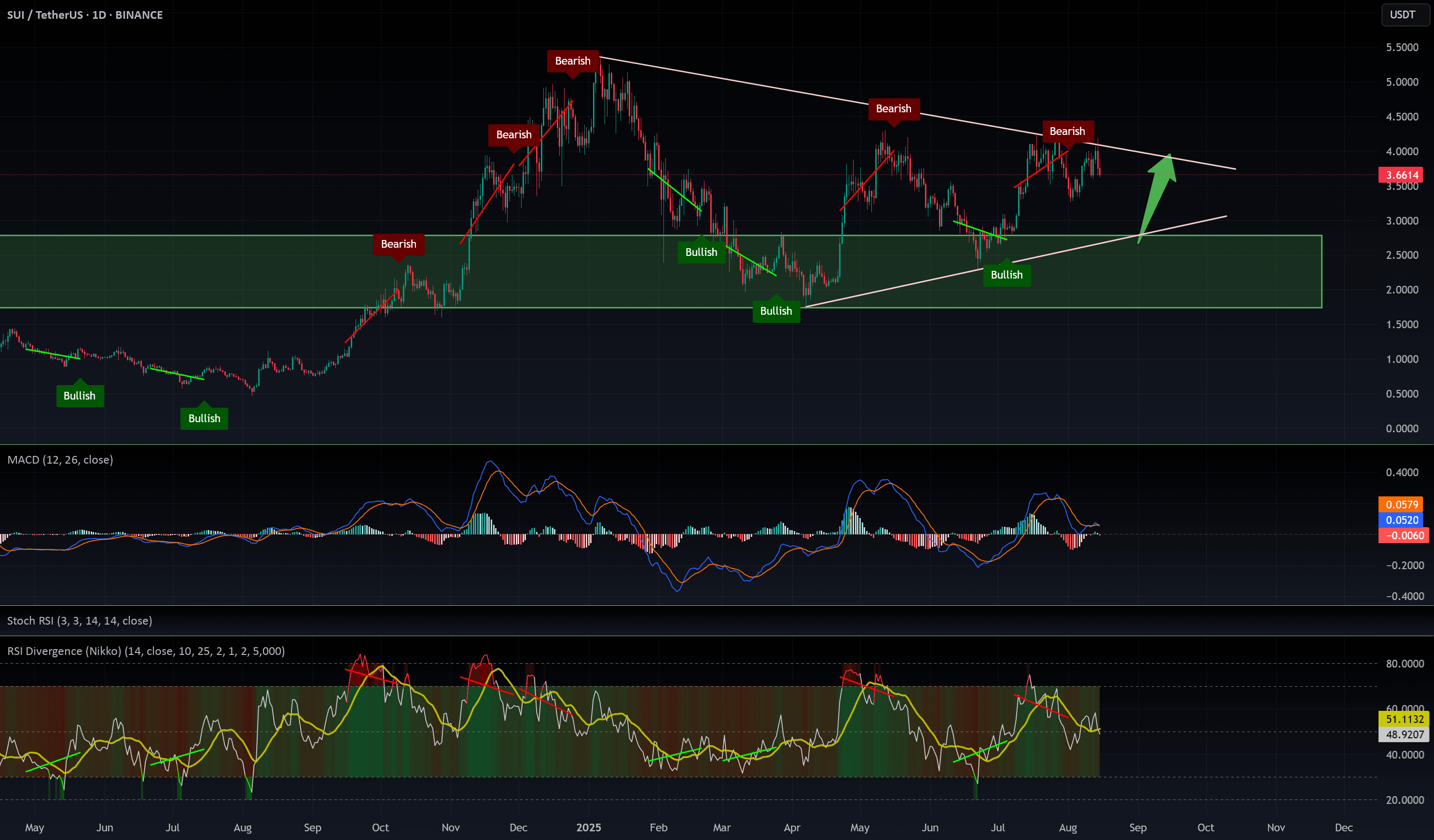 SUI sta mostrando un forte slancio, ma l'attuale consolidamento potrebbe formare un modello a M — un setup ribassista che potrebbe spingere il prezzo giù nella mia zona di acquisto verde.