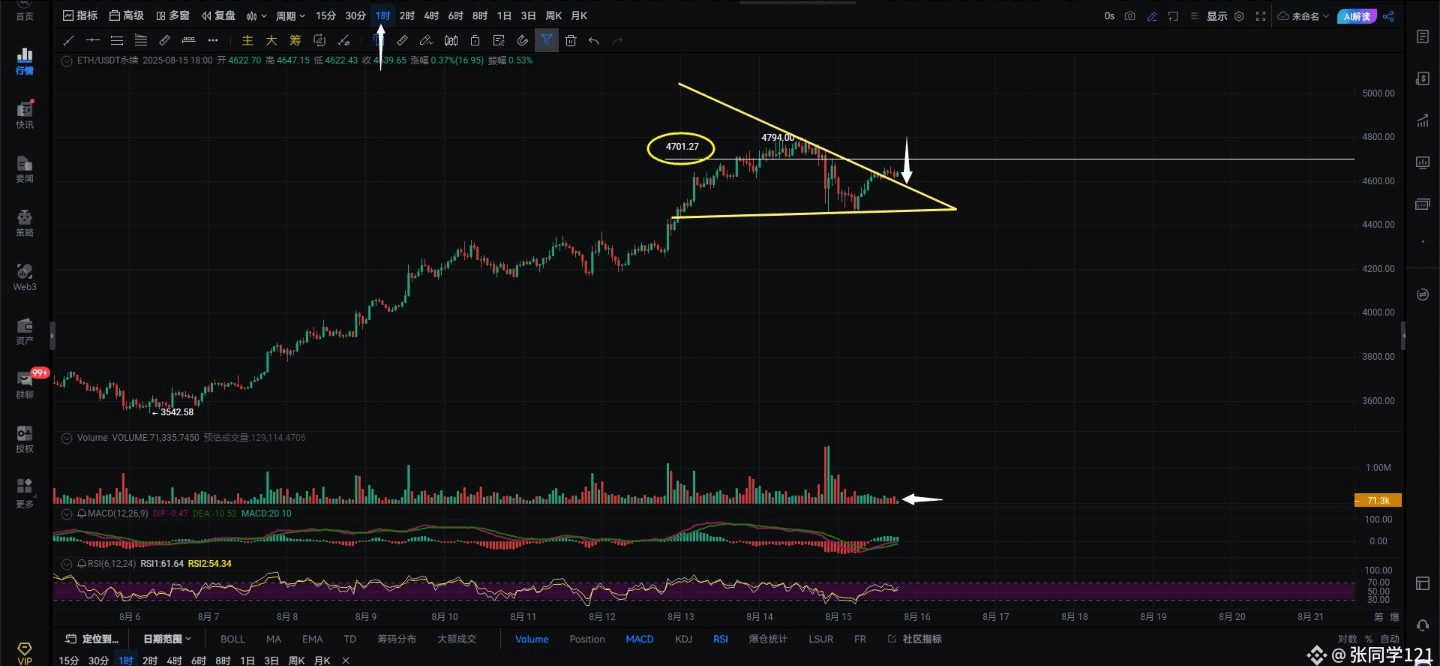$ETH Parlando attraverso il grafico: Il triangolo disegnato nel grafico orario del 2° pie è stato rotto. Vedi il volume indicato dalla freccia bianca qui sotto?