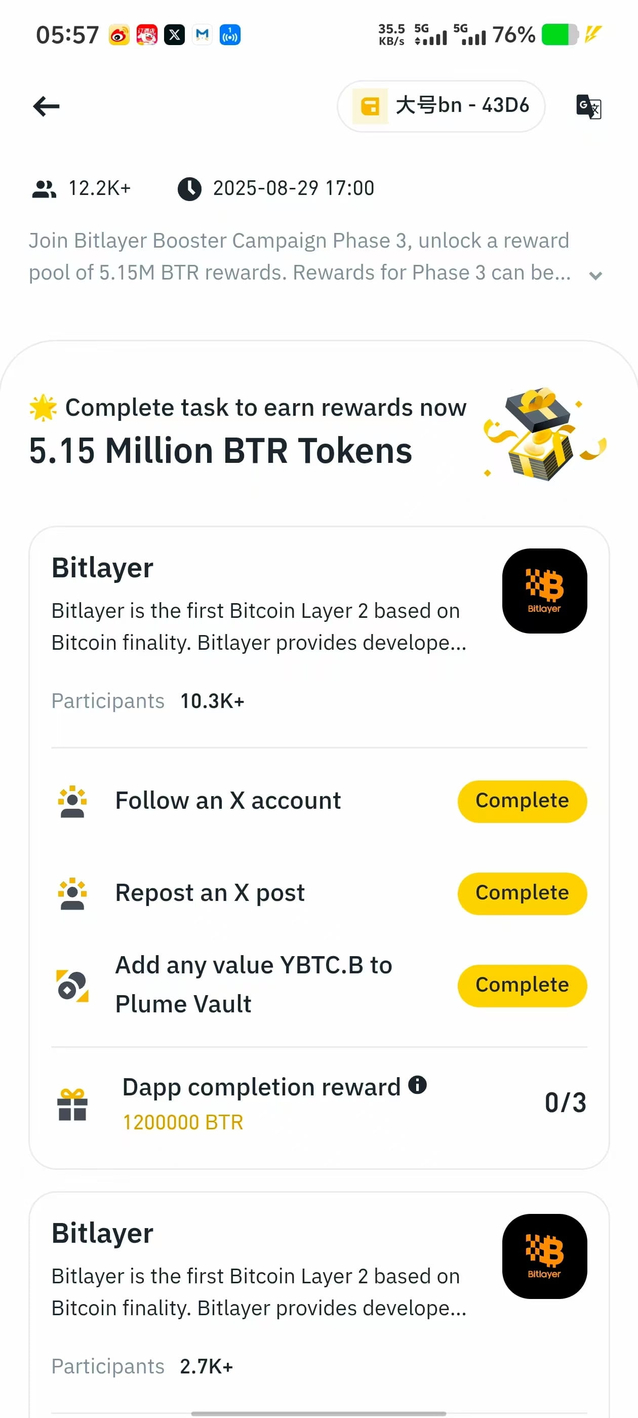 BITLAYER@BitlayerLabs Ha aperto la nuova emissione il 13 agosto, con un costo di circa 28U ha emesso più di 1300 monete, sbloccate dopo l'emissione, la prima e la seconda fase hanno sbloccato le monete quasi immediatamente, attualmente siamo nella terza fase, sblocco dopo 90 giorni dal TGE, valuta tu stesso. Ci sono tre compiti, io ho completato solo il primo, il secondo compito è stato fatto da Fu Ge, il terzo compito è il casco fortunato, puoi controllare la documentazione del progetto, c'è un link per vedere quali ID NFT non sono ancora stati verificati, il costo è piuttosto alto, quindi facciamo qualcosa di più economico#Bitlayer