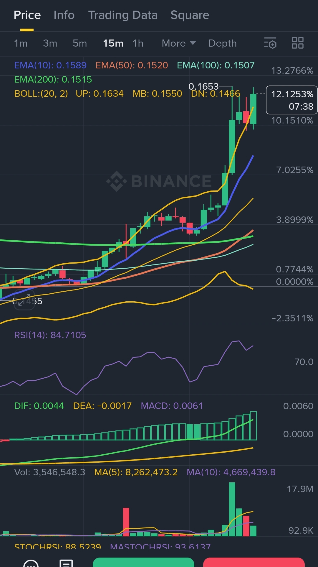- Prezzo (0.1647) trading **AL DI SOPRA** di tutte le EMAs chiave → Forte trend rialzista.