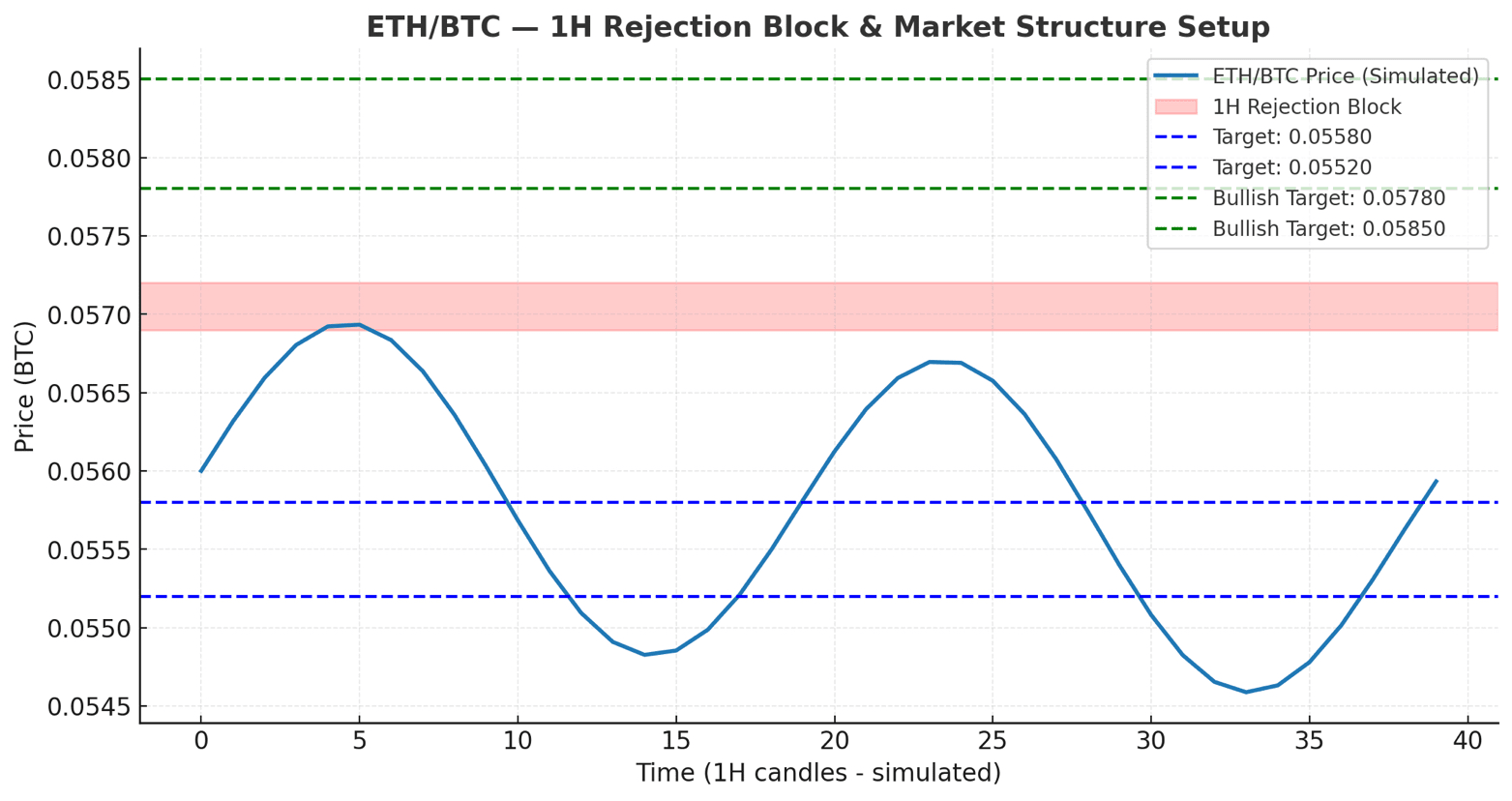 ⚡ In breve: ETH/BTC è in una zona di decisione. Il rifiuto mantiene il 1H ribassista, il recupero ribalta il bias rialzista.