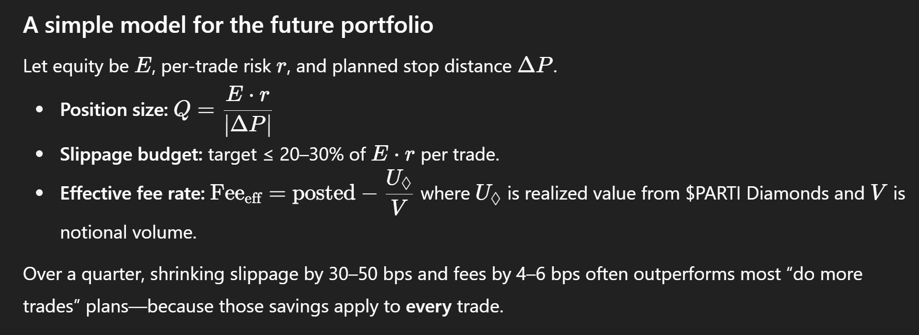 Efficienza delle commissioni: trattare i Diamanti come un rimborso di esecuzione—tracciare il valore realizzato per Diamante e spingere verso il basso la curva delle commissioni effettive.