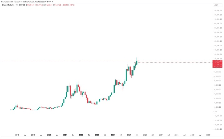 📈 Nel grafico mensile, non c'è molto dramma — sembra ancora sano ✅. Il prezzo è sopra i massimi precedenti e chiaramente in tendenza al rialzo.
