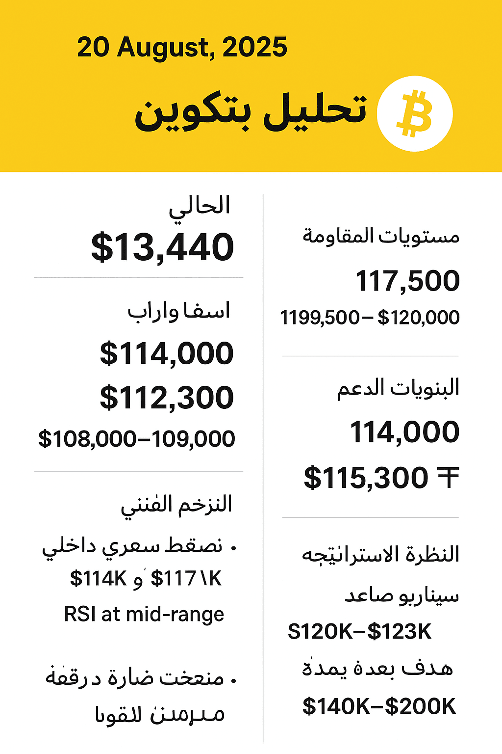 campo valore prezzo attuale ~ $113.440 resistenze principali $117.500 → $119.500–$120.000 livelli di supporto $114.000 → $112.300 → $108.000–$109.000 scenario al rialzo test $120–$123K, obiettivo a lungo $140–$200K scenario al ribasso rottura per $108–$109K