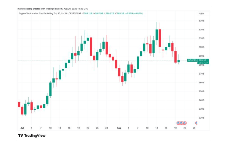 “Tuttavia, potremmo vedere un graduale sanguinamento, a cascata blocco per blocco. Mentre i principali rimangono stabili, un movimento del 5% di BTC potrebbe innescare cali del 10–30% negli altcoin.”