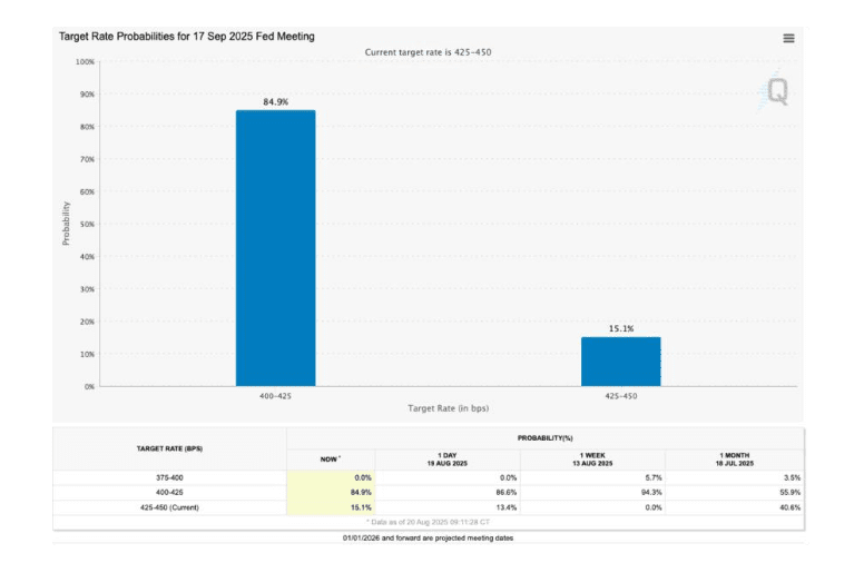 “I mercati stanno attualmente prezzando un'80–95% di probabilità di un taglio di 25 punti base al FOMC del 17 settembre, tuttavia i dati in arrivo potrebbero modificare rapidamente le aspettative.”