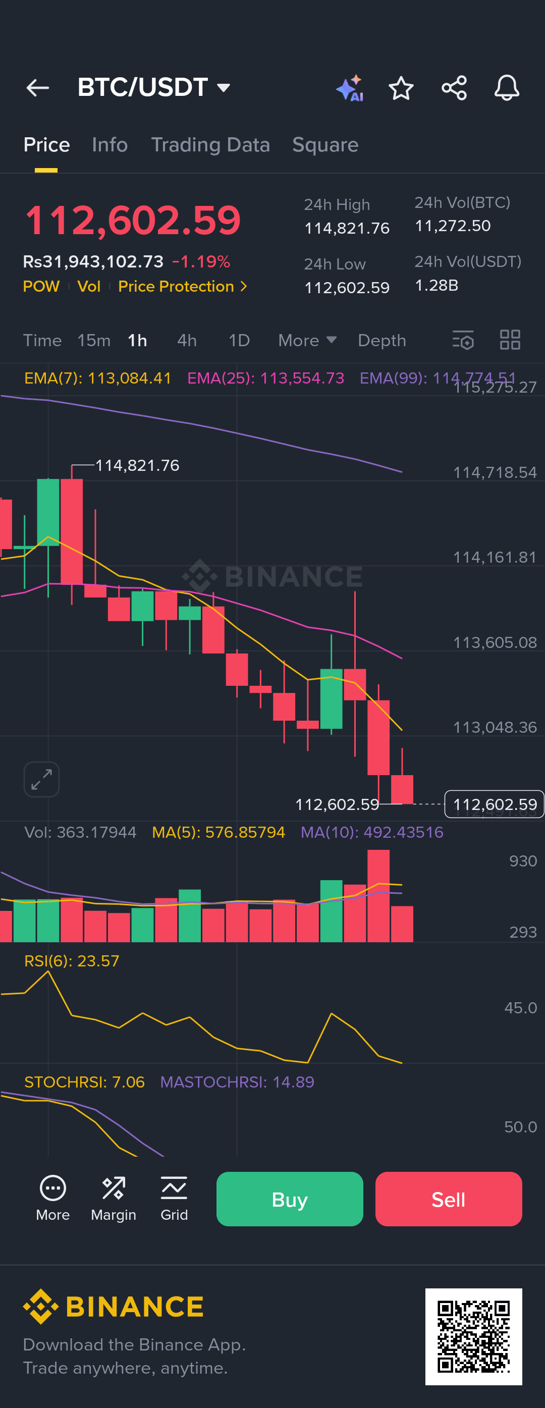 Bitcoin sta attualmente scambiando intorno a $112,602, segnando un calo intraday del -1.19% mentre i venditori continuano a dominare. Il movimento arriva dopo che BTC ha toccato un massimo di 24 ore vicino a $114,821 prima di scivolare al minimo del giorno a $112,602.