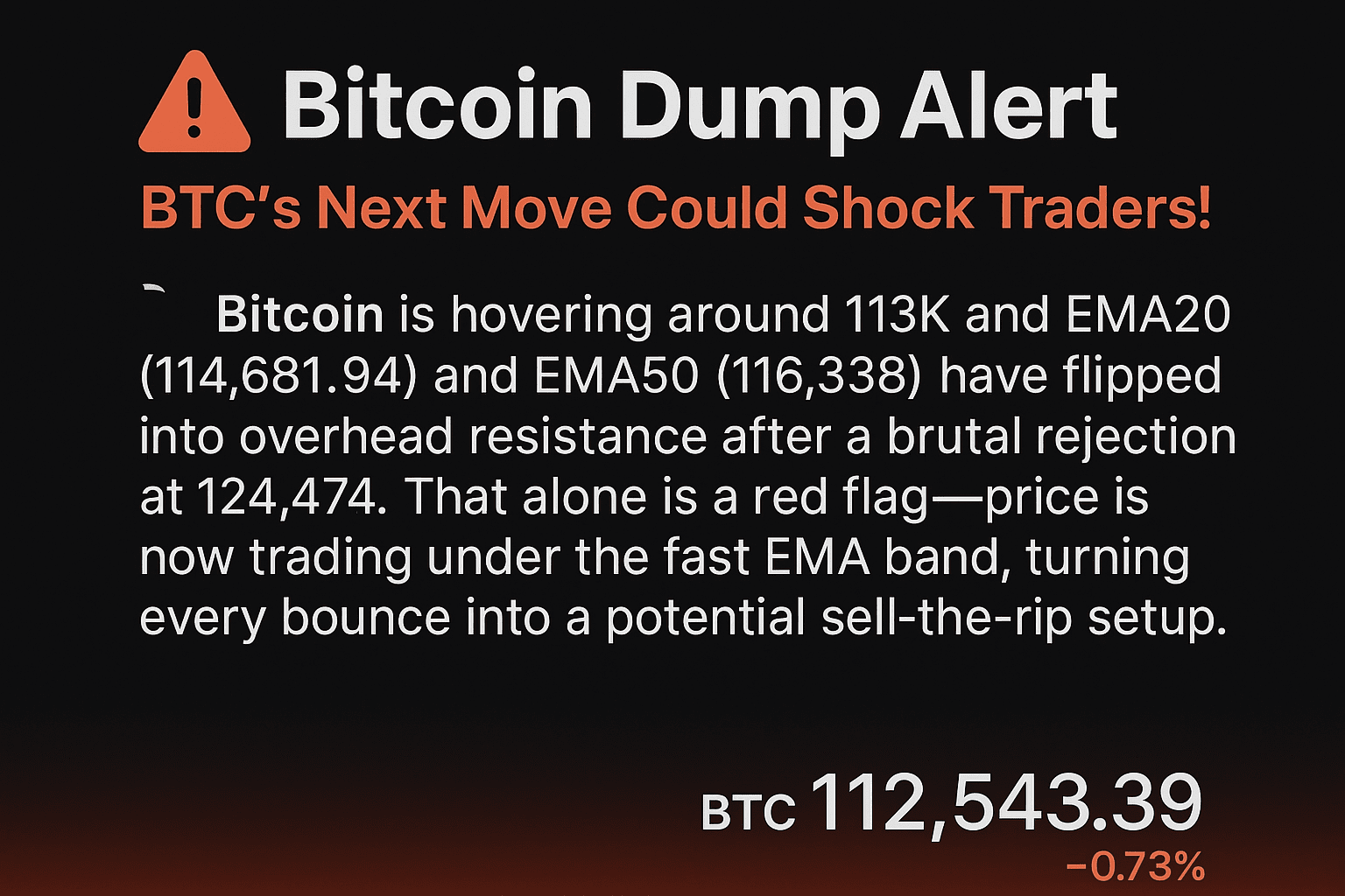 $BTC sta lottando vicino a 113K, con EMA20 (114.681) e EMA50 (116.338) che si trasformano in una forte resistenza dopo il rifiuto a 124.474. Il prezzo ora è sotto la banda EMA veloce — ogni rimbalzo sembra un setup di vendita.