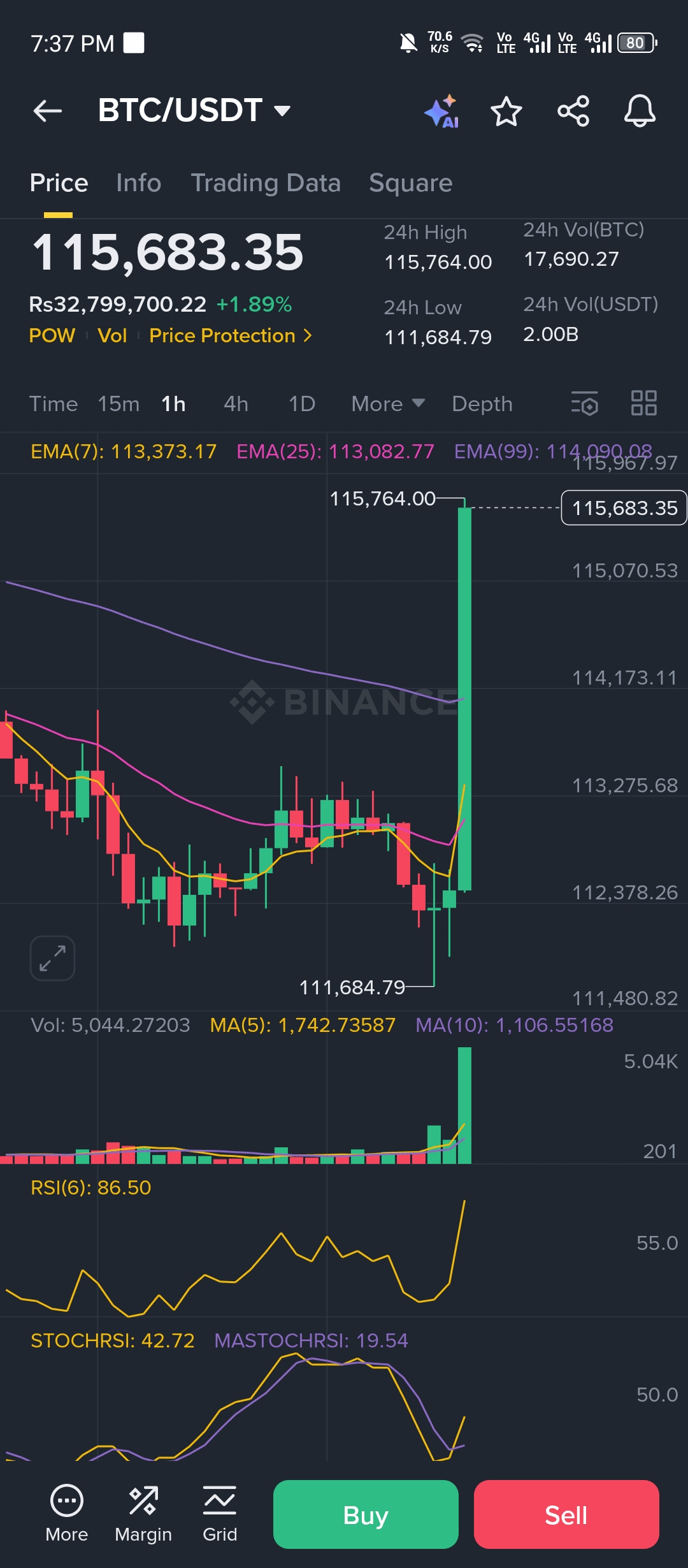 RSI(6) = 86.5 → Profondamente nell'area di ipercomprato