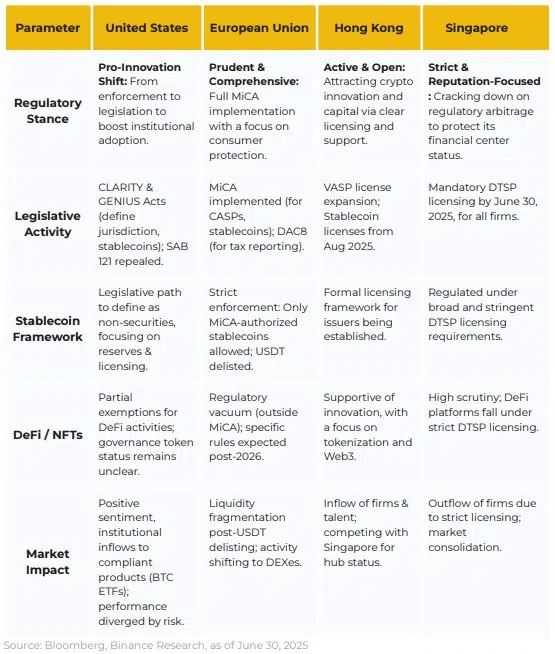 Secondo un rapporto recente di Binance Research, il primo semestre del 2025 è stato un punto di svolta nella regolamentazione globale delle criptovalute. Il documento sostiene che i quadri normativi più chiari e le stablecoin, insieme agli ETF, hanno consolidato il settore come un componente strutturale dell'economia globale.