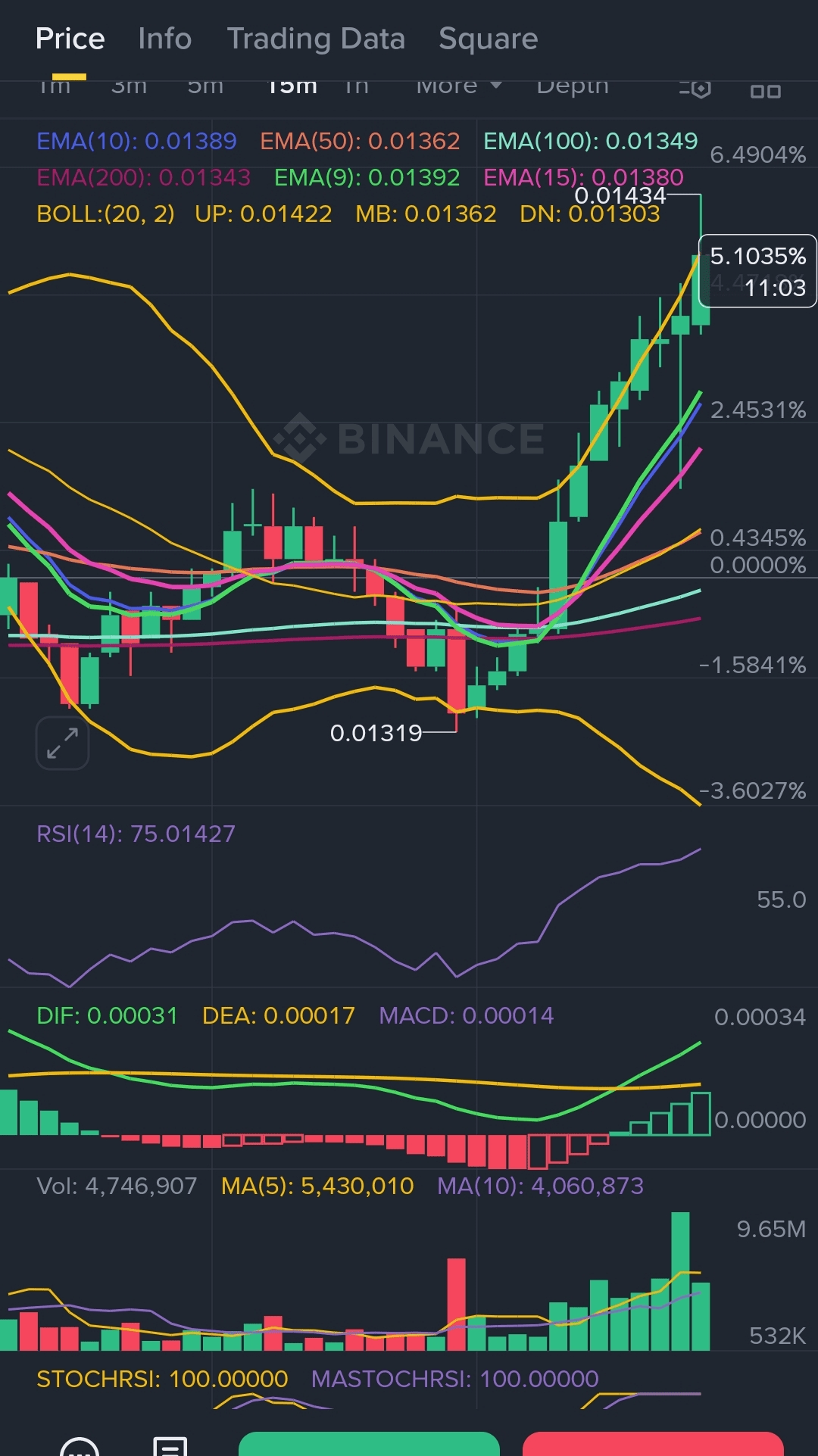 La banda si sta espandendo — la volatilità sta aumentando! Il prezzo sta toccando la Banda Superiore (0.01449), il che suggerisce un forte momentum rialzista. Una rottura e chiusura sopra può portare a una continuazione verso 0.0150.