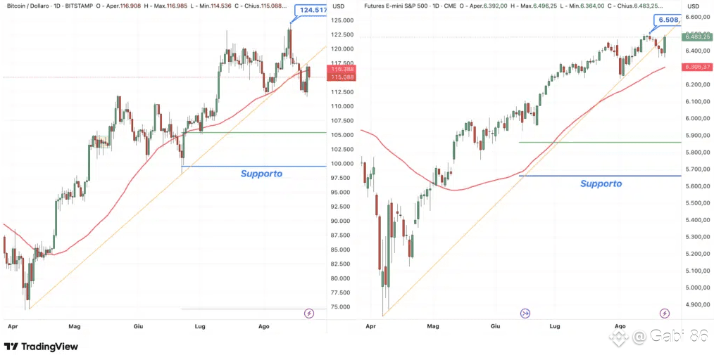 Se l’andamento di Bitcoin da inizio 2025 è ampiamente superiore a quello degli indici azionari, focalizzandoci sulle ultime settimane dal grafico allegato possiamo osservare come il prezzo sia entrato in una fase di flessione più marcata dopo il suo ATH a 124.517$.
