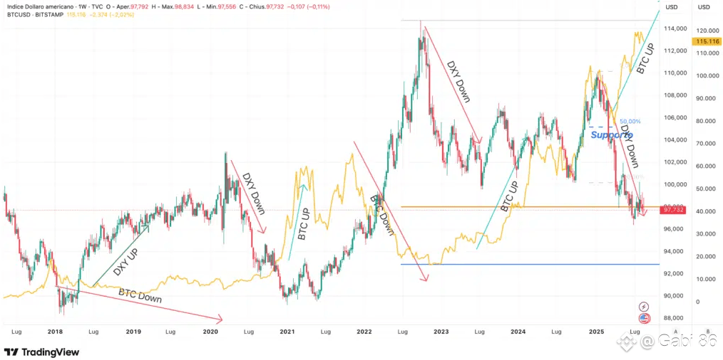 Storicamente, Bitcoin ha mostrato una correlazione inversa con il DXY: quando l’indice sale, BTC tende a indebolirsi, mentre un calo del dollaro aumenta l’appetito per il “risk on” e sostiene il ruolo di Bitcoin come riserva alternativa di valore. Allo stato attuale, l’andamento di questo 2025 sta confermando la tendenza storica.