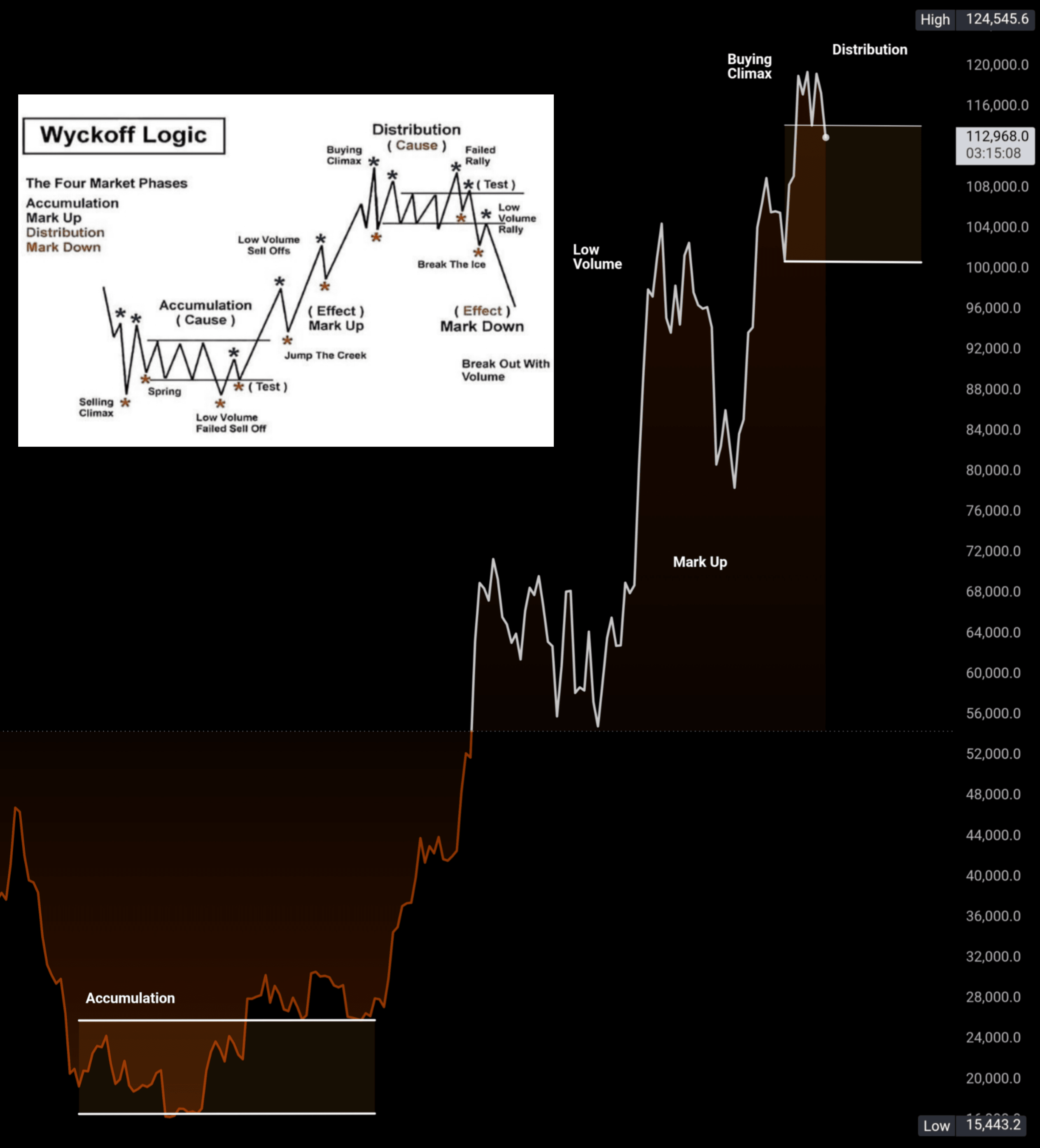 Ciò che abbiamo attraversato: abbiamo concluso la fase di accumulo + il decollo + l'impulso della liquidità… e ora siamo in fase di distribuzione.