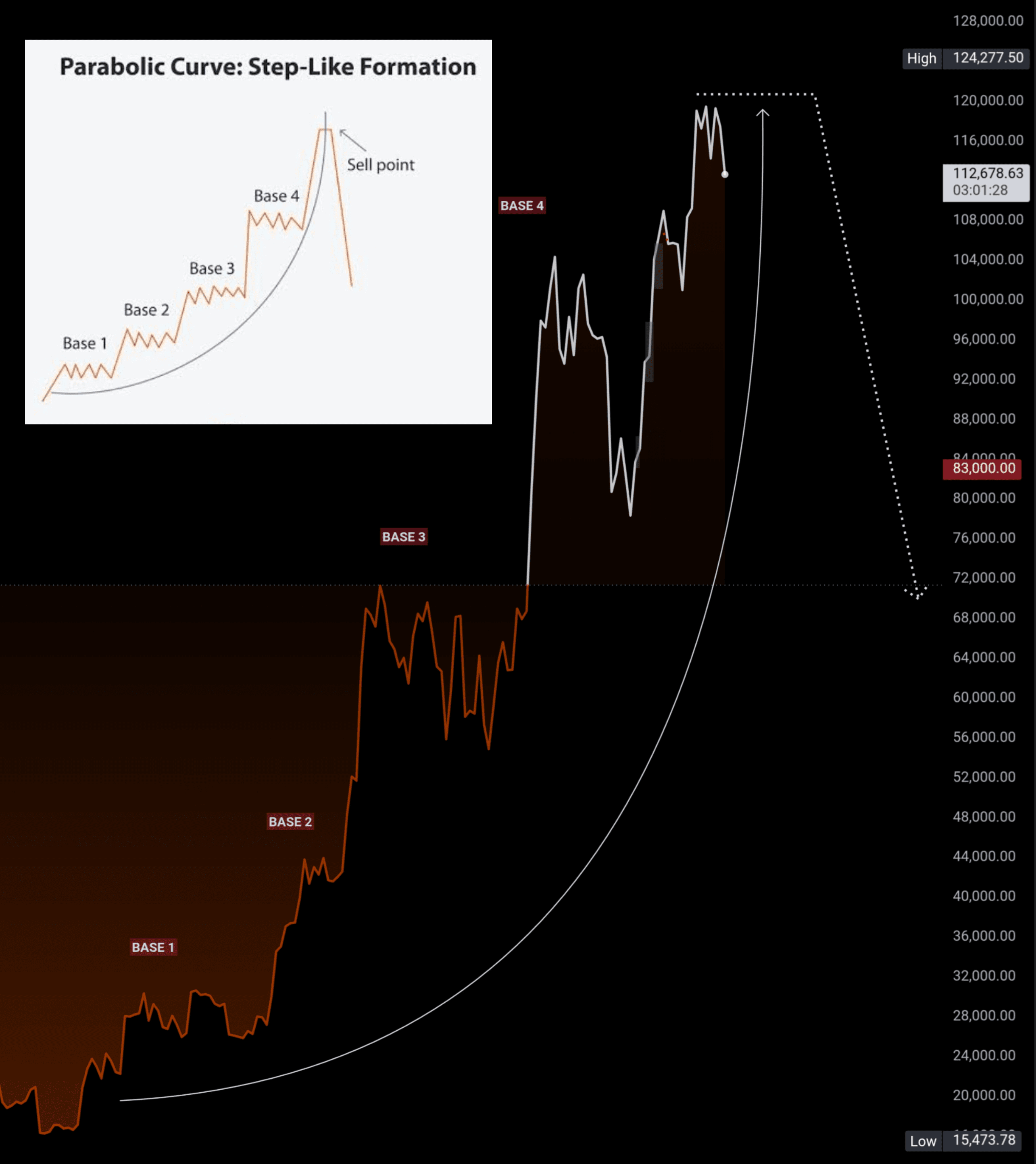 Una volta che viene rotta l'ultima regola, si verifica il Parabolic Blow-off, un calo verticale che di solito punta a 83.000 – 72.000 come aree di rimbalzo iniziali.