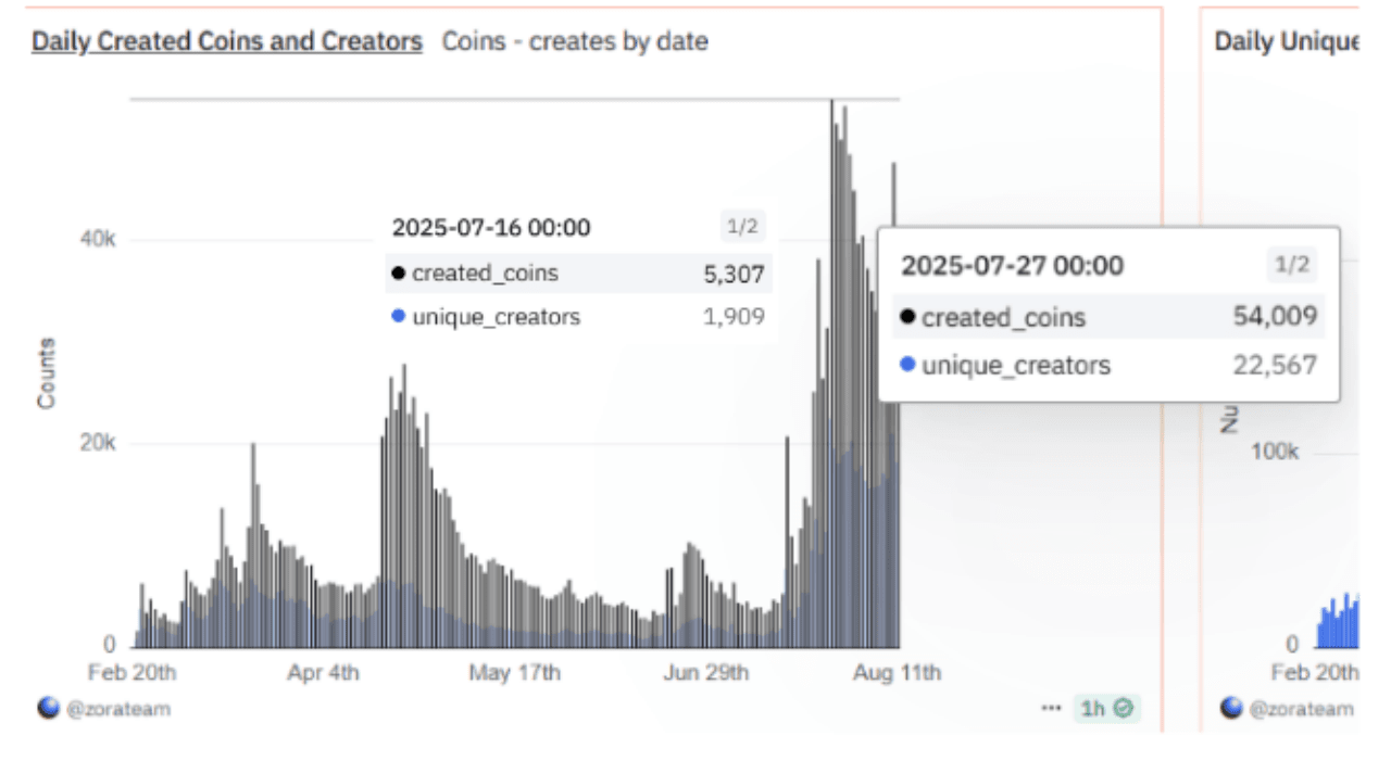 • Il numero di creatori attivi indipendenti su Zora è passato da 2.000 il 16 luglio 2025 (il giorno prima del lancio dell'App Base) a 22.500 il 27 luglio.