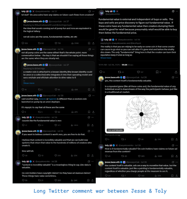 • Toly ha messo in dubbio il valore della tokenizzazione dei post sui social media di Zora, persino chiedendo sarcasticamente: 'lol wut? I token su Zora possono accedere ai flussi di cassa futuri dei creatori?' Ha definito questi token 'rifiuti digitali', paragonandoli a NFT speculativi o ai giochi mobile con scatole misteriose.
