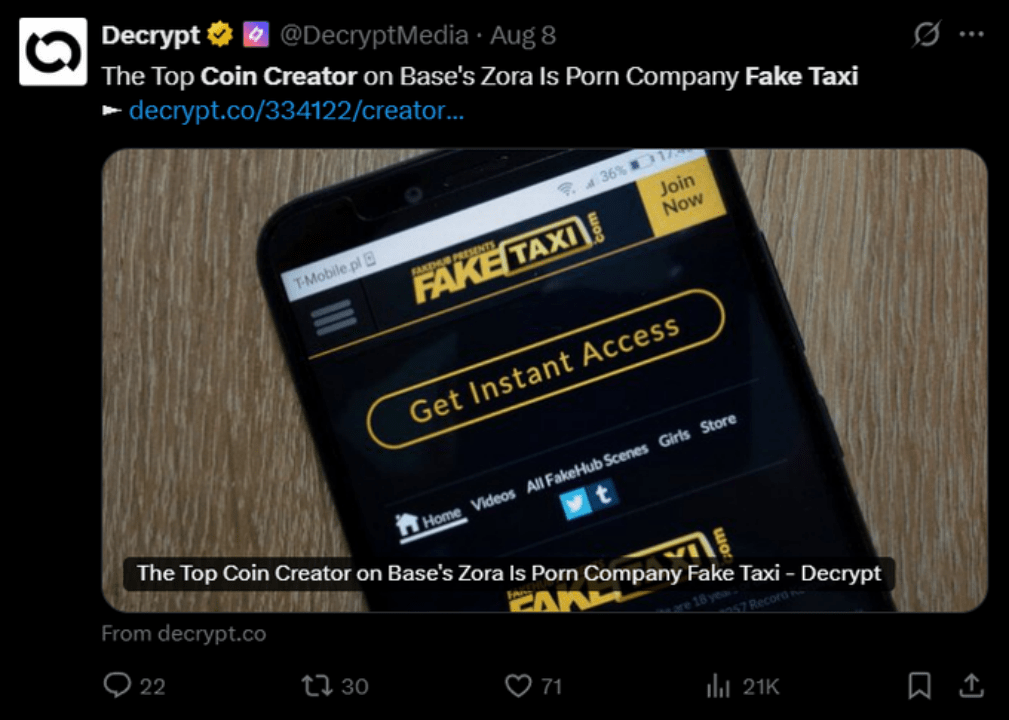 • Controversie sulla moderazione dei contenuti: la scorsa settimana, il token in cima alla classifica della piattaforma Base era addirittura quello di un sito pornografico, suscitando numerose critiche (fonte: Decrypt).