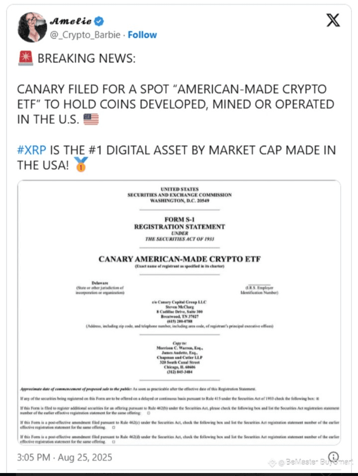 $XRP L'influencer crypto Amelie ha riportato che Canary ha presentato una dichiarazione di registrazione Form S-1 alla Securities and Exchange Commission degli Stati Uniti per un fondo negoziato in borsa denominato “Canary American-Made Crypto ETF.”
