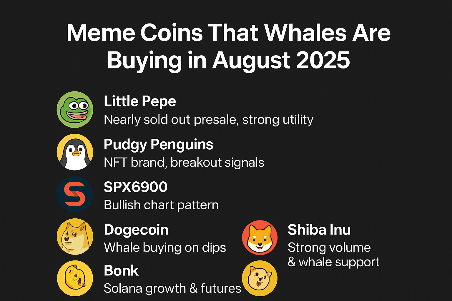 Nell'agosto 2025, grandi investitori (chiamati anche balene) stanno acquistando alcune monete meme in grandi quantità. Questo mostra quali monete hanno una forte domanda e possibile crescita. Ecco le prime 6 monete meme: