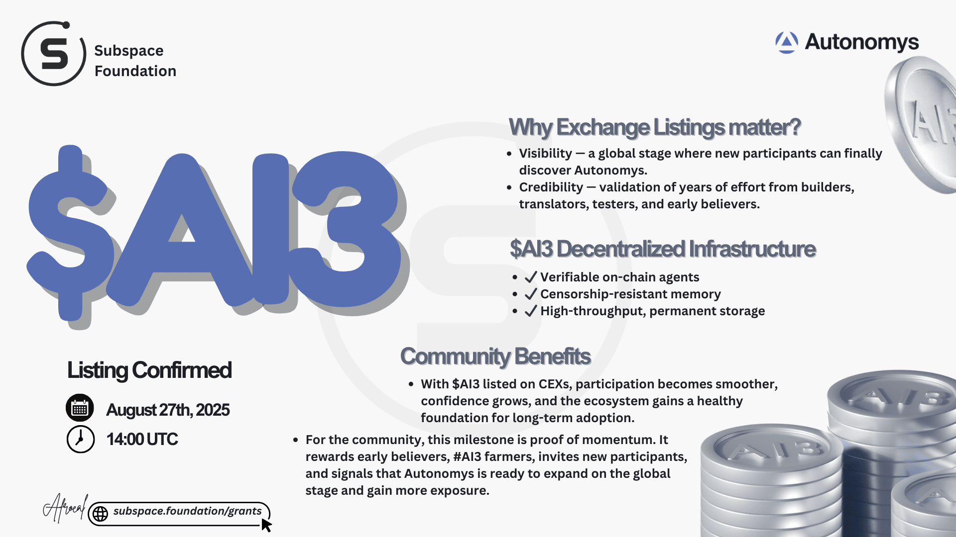 L'attesa è quasi finita poiché #Autonomys il token nativo, $AI3, si prepara a diventare operativo nei principali scambi centralizzati il 27 agosto alle 14:00 UTC. Non è solo un'altra quotazione, è un momento decisivo per la convergenza tra Web3 e IA.