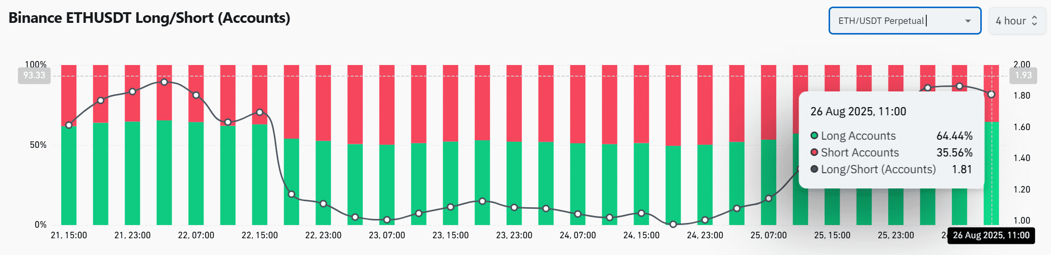 Sulla piattaforma Binance, circa il 64,44% degli account ha posizioni lunghe, mentre le posizioni corte sono solo il 35,56%, con un rapporto long/short di 1,81. La maggior parte dei trader scommette su un recupero di ETH; questo affollamento di sentiment rialzista potrebbe supportare l'aumento dei prezzi, ma se il prezzo incontra resistenza o corregge, le liquidazioni concentrate potrebbero causare fluttuazioni a breve termine. Sebbene il mercato sia inclinato all'ottimismo, quando i livelli di resistenza sono robusti, i rialzisti potrebbero essere costretti a osservare, rendendo inevitabili le fluttuazioni a breve termine.