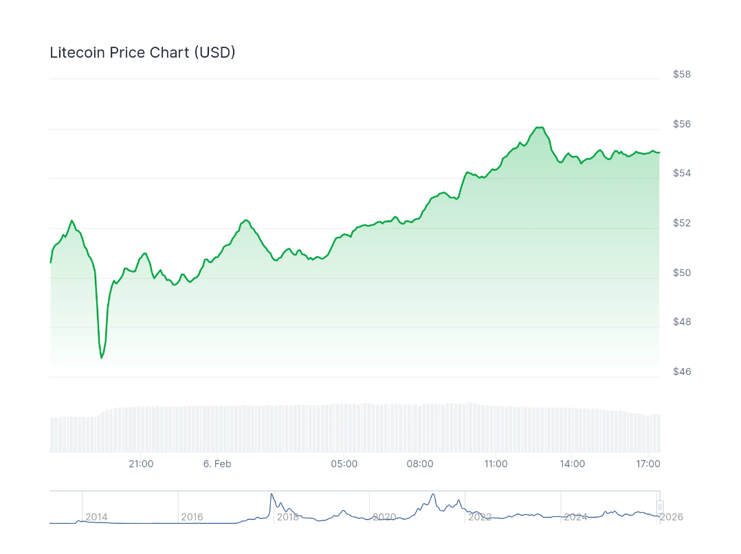 Litecoin ha visto un aumento dell'8%, scambiando intorno ai $54, mentre i trader si sono spostati verso le altcoin dopo il recupero di Bitcoin e la riduzione dello stress da margine.
