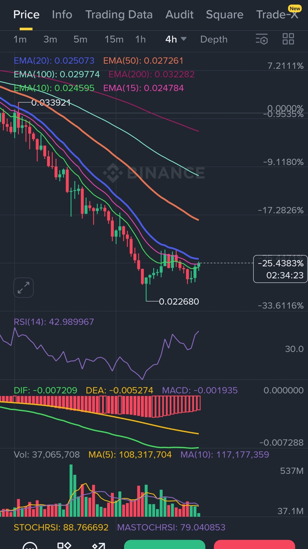 · MACD (1D/4H): La storia di due tendenze. Su timeframe superiori, il MACD è negativo (DIF: -0.0072, DEA: -0.00527), indicando una forza ribassista. Tuttavia, sul grafico da 15 minuti, osserviamo un CROSSOVER BULLISH con il MACD che diventa positivo (0.000306)! Un potenziale segnale di inversione a breve termine!
