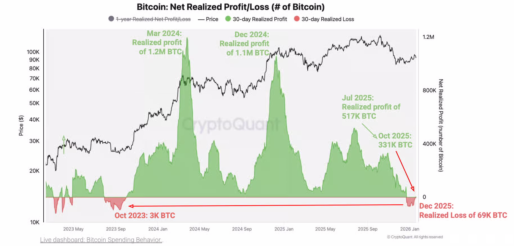 I dati on-chain rivelano una verità che molti grafici preferiscono nascondere: i mercati non si riprendono quando la volatilità diminuisce, ma quando le perdite vengono effettivamente realizzate. Il rapporto Profitto/Perdita Realizzati rende questo dolorosamente chiaro. Ai picchi del ciclo, i profitti dominano, il rapporto si espande e la fiducia cresce forte; quando i cicli si rompono, quel rapporto crolla - a volte violentemente. All'inizio del 2026, il rapporto Profitto/Perdita Realizzati è sceso bruscamente dai livelli euforici della metà del 2025 e ora si aggira intorno a una zona in cui i profitti superano di poco le perdite. Questa non è una ripresa; è una digestione. L'alone non può tornare mentre il mercato sta ancora inghiottendo i propri errori. Solo quando le perdite realizzate rallentano - quando i venditori non sono più costretti ma esausti - il mercato riacquista la capacità di credere.