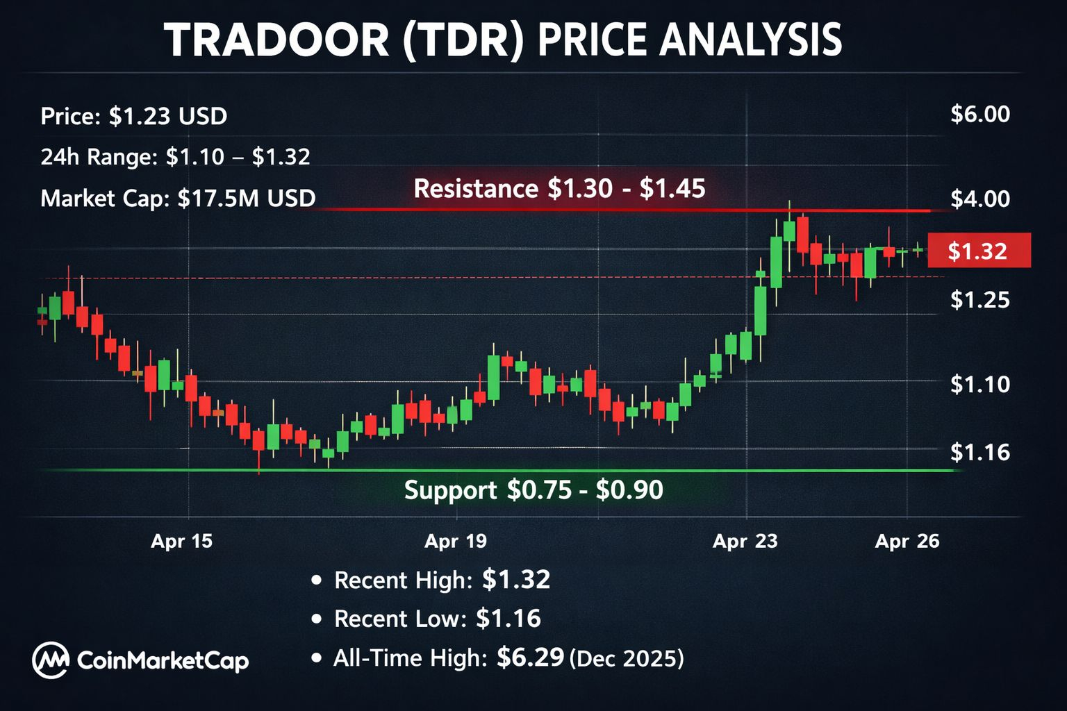 #TRADOOR Basato sui dati pubblici di prezzo più recenti, TRADOOR sta negoziando intorno a $1.20–$1.25 USD con un intervallo di 24 ore di circa $1.10 a $1.32 USD e una capitalizzazione di mercato vicino a $17–18 milioni USD. Il prezzo rimane significativamente al di sotto del suo massimo storico di circa $6.29 USD (Dic 2025). �