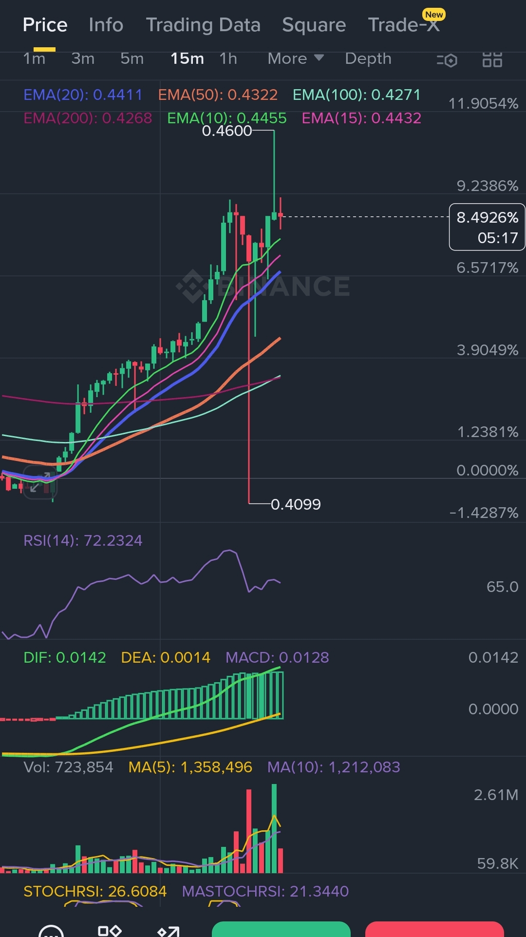 · Aspetta che una candela a 15 minuti si chiuda SOPRA $0.450 con volume in aumento.