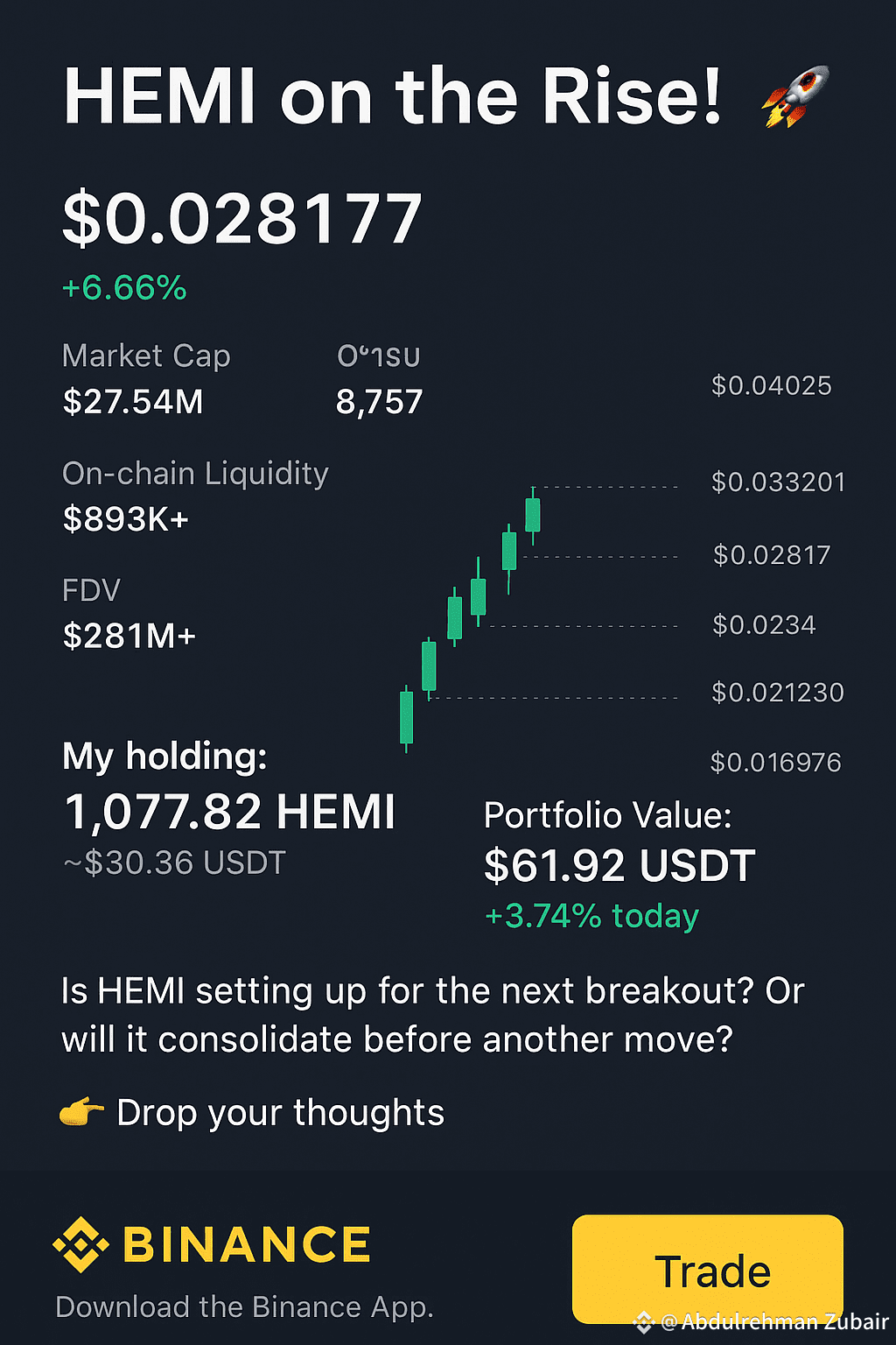 💰 My holding: 1,077.82 HEMI (~$30.36 USDT)