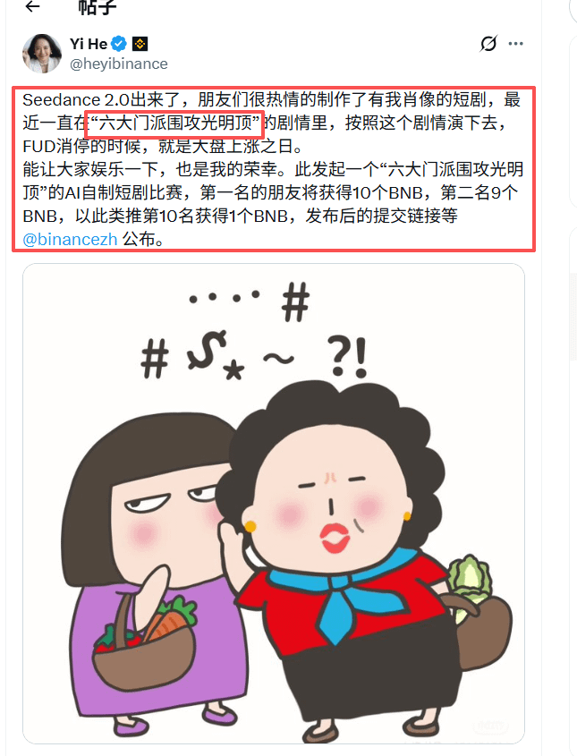 针对近期外界对币安的各种攻击,一姐 @Yi He 祭出大招,以中国武侠小说中的六大门派围攻光明顶的案例,发起一项AI短剧活动,这无疑是一次有力的反击,也从内心独白的说明:我币安才是江湖盟主,你们只管放马过来!