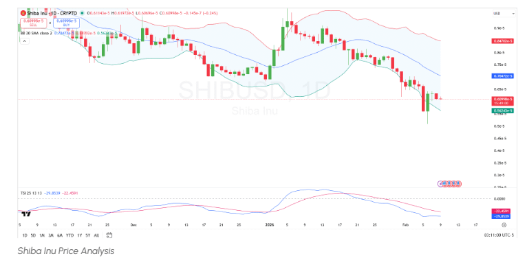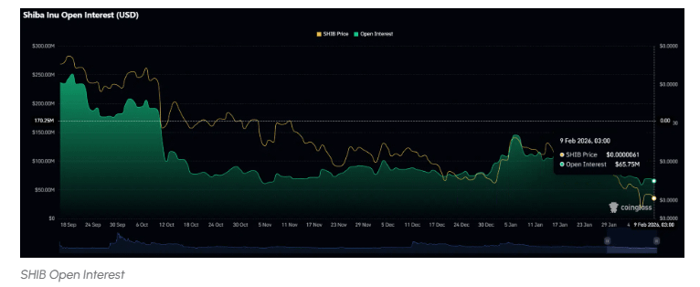 Shiba Inu’s open interest data points to continued deleveraging alongside price weakness, reinforcing the cautious tone across derivatives markets. Open interest has steadily declined from the $200 million–$250 million range recorded in late September 2025 to approximately $65.75 million as of February 9, 2026, according to CoinGlass.