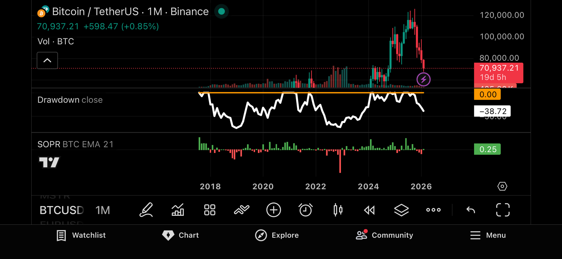 Se la prima paura è il dubbio, la seconda è il dolore. Il drawdown mostra quanto danno il mercato ha assorbito, mentre SOPR rivela se i partecipanti stanno vendendo in profitto o in perdita.