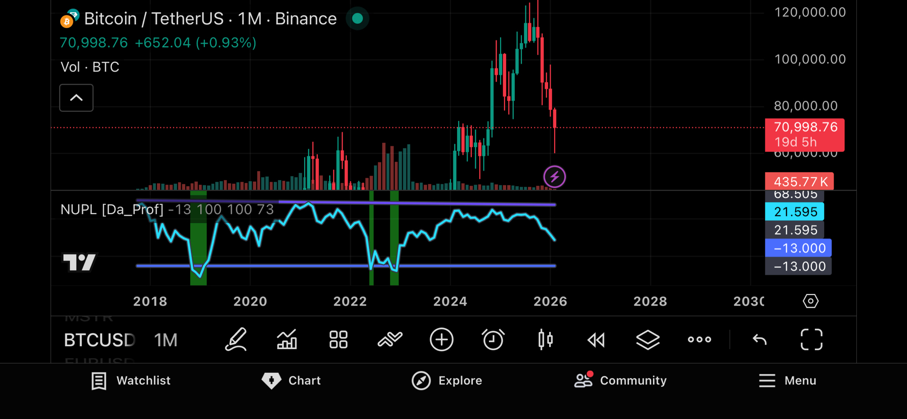 Quando il prezzo scende profondamente e per un lungo periodo, la maggiore paura non è perdere denaro, ma comprare troppo presto. Il NUPL (Profitto/Perdita Netta Non Realizzata) riflette perfettamente questo stato.